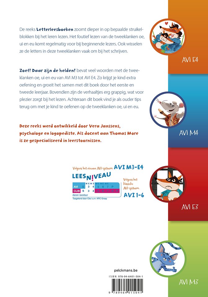 In Zoef! Daar zijn de helden! volgen we de drie superhelden Ra, Kuif en Does de poes, onder begeleiding van sensei Eustasius. Hun tegenstander is Jos de vos. Moe de koe is dan weer het slachtoffer dat steeds gered moet worden. Zoef! bevat grappige en rijkelijk geïllustreerde verhaaltjes van AVI M3 tot AVI E4, waardoor jouw kind en het boek samen ‘groeien’ doorheen het eerste en tweede leerjaar.
