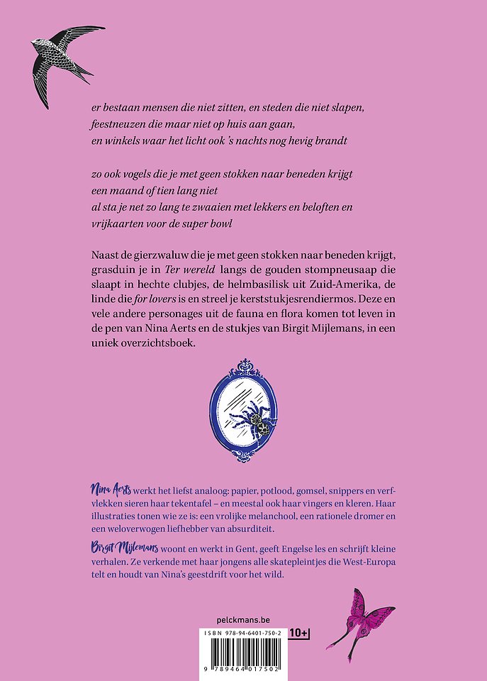 Naast de gierzwaluw die je met geen stokken naar beneden krijgt, grasduin je in Ter wereld langs de gouden stompneusaap die slaapt in hechte clubjes, de helmbasilisk uit Zuid-Amerika, de linde die for lovers is en streel je kerststukjesrendiermos. Deze en vele andere personages uit de fauna en flora komen tot leven in de pen van Nina Aerts en de stukjes van Birgit Mijlemans, in een uniek overzichtsboek.