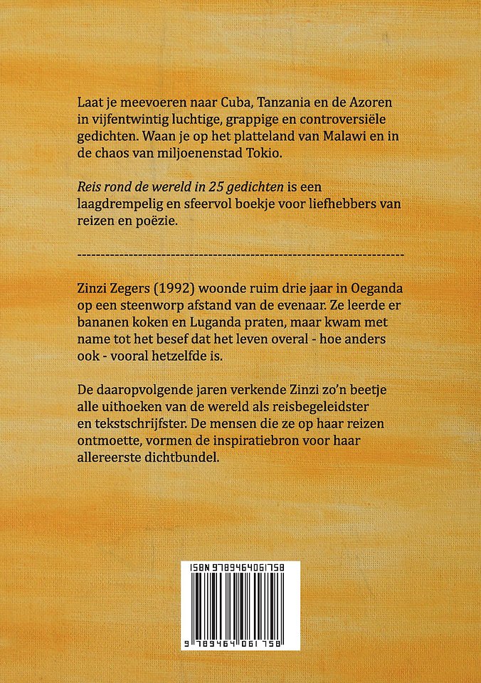 Zinzi Zegers (1992) woonde ruim drie jaar in Oeganda op een steenworp afstand van de evenaar. Ze leerde er bananen koken en Luganda praten, maar kwam met name tot het besef dat het leven overal - hoe anders ook- vooral hetzelfde is. De daaropvolgende jaren verkende Zinzi zo’n beetje alle uithoeken van de wereld als reisbegeleidster en tekstschrijfster. De mensen die ze op haar reizen ontmoette, vormen de inspiratiebron voor haar allereerste dichtbundel.