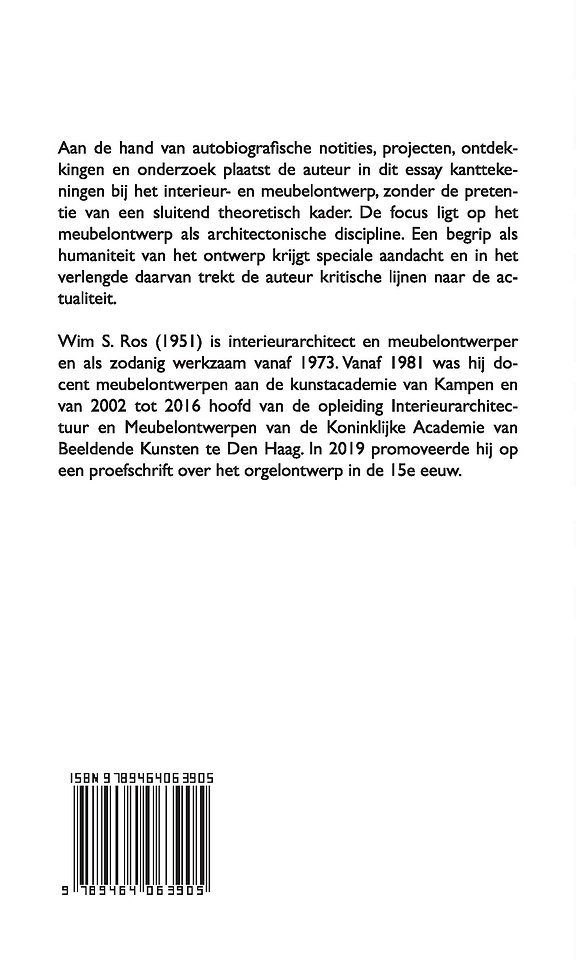 Aan de hand van autobiografische notities, projecten, ontdekkingen en onderzoek plaatst de auteur in dit essay kanttekeningen bij het interieur- en meubelontwerp, zonder de pretentie een sluitend theoretisch kader te bieden. De focus ligt op het meubelontwerp als architectonische discipline. Een begrip als humaniteit van het ontwerp krijgt speciale aandacht en in het verlengde daarvan trekt de auteur kritische lijnen naar de actualiteit.