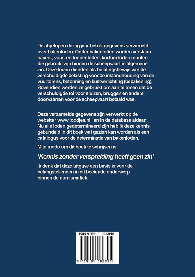 De afgelopen dertig jaar heb ik gegevens verzameld over bakenloden. Onder bakenloden worden verstaan haven-, vuur- en tonnenloden, kortom loden munten die gebruikt zijn binnen de scheepvaart in algemene zin. Deze loden dienden als betalingsbewijs van de verschuldigde belasting voor de instandhouding van de vuurtorens, betonning en kustverlichting (bebakening). Bovendien werden ze gebruikt om aan te tonen dat de verschuldigde tol voor sluizen, bruggen en andere doorvaarten voor de scheepvaart betaald was. Deze verzamelde gegevens zijn verwerkt op de website ‘ www.loodjes.nl ’ en in de database aldaar. Nu alle loden gedetermineerd zijn heb ik deze kennis gebundeld in dit boek wat gezien kan worden als een catalogus voor de determinatie van bakenloden.
