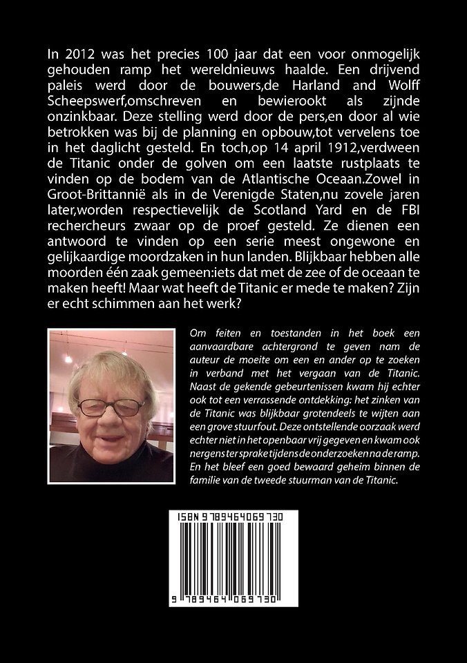 In 2012 was het precies 100 jaar dat een voor onmogelijk gehouden ramp het wereldnieuws haalde. Een drijvend paleis werd door de bouwers, de Harland and Wolff Scheepswerf, omschreven en bewierookt als zijnde onzinkbaar. Deze stelling werd door de pers, en door al wie betrokken was bij de planning en opbouw, tot vervelens toe in het daglicht gesteld. En toch, op 14 april 1912, verdween de Titanic onder de golven om een laatste rustplaats te vinden op de bodem van de Atlantische Oceaan. Zowel in Groot-Brittannië als in de Verenigde Staten, nu zovele jaren later, worden respectievelijk de Scotland Yard en de FBI rechercheurs zwaar op de proef gesteld. Ze dienen een antwoord te vinden op een serie meest ongewone en gelijkaardige moordzaken in hun landen. Blijkbaar hebben alle moorden één zaak gemeen: iets dat met de zee of de oceaan te maken heeft! Maar wat heeft de Titanic er mede te maken? Zijn er echt schimmen aan het werk? Om feiten en toestanden in het boek een aanvaardbare achtergrond te geven nam de auteur de moeite om een en ander op te zoeken in verband met het vergaan van de Titanic. Naast de gekende gebeurtenissen kwam hij echter ook tot een verrassende ontdekking: het zinken van de Titanic was blijkbaar grotendeels te wijten aan een grove stuurfout. Deze ontstellende oorzaak werd echter niet in het openbaar vrij gegeven en kwam ook nergens ter sprake tijdens de onderzoeken na de ramp. En het bleef een goed bewaard geheim binnen de familie van de tweede stuurman van de Titanic.