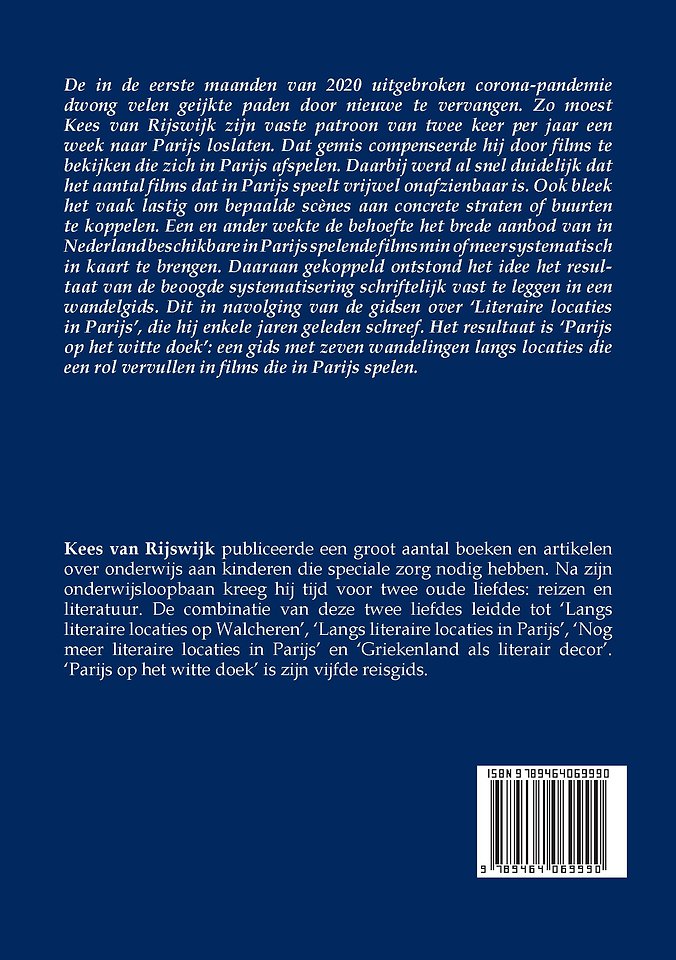 De in de eerste maanden van 2020 losgebroken coronapandemie dwong velen geijkte paden door nieuwe te vervangen. Zo moest Kees van Rijswijk zijn vaste patroon van twee keer per jaar een week naar Parijs loslaten. Dat gemis compenseerde hij door films te bekijken die zich in Parijs afspelen. Daarbij werd al snel duidelijk dat het aantal films dat in Parijs speelt schier onafzienbaar is. Ook bleek het vaak lastig om bepaalde scènes aan concrete straten of buurten te koppelen. Een en ander wekte de behoefte het brede aanbod van in Nederland beschikbare in Parijs spelende films min of meer systematisch in kaart te brengen. Daaraan gekoppeld ontstond het idee het resultaat van de beoogde systematisering schriftelijk vast te leggen in een wandelgids. Dit in navolging van de gidsen over ‘Literaire locaties in Parijs’, die hij enkele jaren geleden schreef (Van Rijswijk, 2018 en 2019). Het resultaat is ‘Parijs op het witte doek’: een gids met zeven wandelingen langs locaties die een rol vervullen in films die in Parijs spelen.