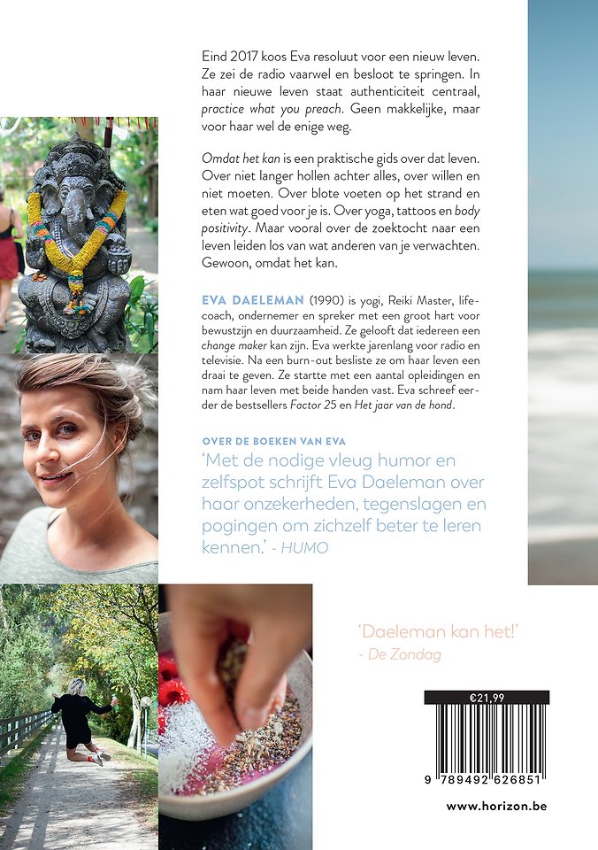 Eind 2017 koos Eva Daeleman resoluut voor een nieuw leven waarin authenticiteit de sleutel is: practice what you preach. Geen makkelijke weg, maar voor haar wel de enige weg. Dit boek is een praktische gids voor het leven. Over niet langer hollen achter je leven, over willen en niet moeten. Over blote voeten op het strand en eten wat goed voor je is. Over yoga, tattoos en body positivity. Maar vooral over de zoektocht naar een leven leiden los van wat anderen van je verwachten.