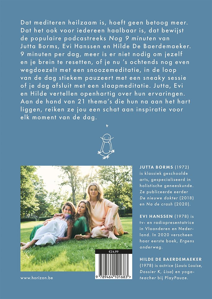 Dat mediteren heilzaam is, hoeft geen betoog meer. Dat het ook voor iedereen haalbaar is, dat bewijst de podcastreeks Nog 9 minuten. 9 minuten per dag, meer is er niet nodig, of je nu 's ochtends wegdoezelt met een snoozemeditatie, overdag pauzeert met een sneaky sessie of je dag afsluit met een slaapmeditatie. De behoefte aan een dagelijkse dosis zelfzorg, positiviteit en veerkracht is hoog. In dit boek vertellen Evi Hanssen, Jutta Borms en Hilde De Baerdemaeker openhartig over hun ervaringen. Aan de hand van 21 thema's reiken ze jou een schat aan inspiratie aan voor elk moment van de dag.