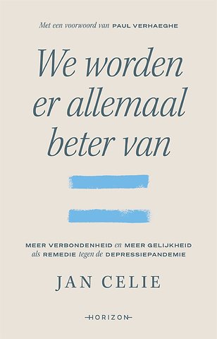 In 2030 zal depressie wereldwijd het meest voorkomende gezondheidsprobleem zijn: we kunnen spreken van een alarmerend groeiende depressiepandemie. Depressie wordt als 'ziekte' of 'stoornis' vrijwel uitsluitend op individueel niveau gediagnosticeerd en behandeld. Maar in We worden er allemaal beter van argumenteert klinisch psycholoog Jan Celie dat de maatschappelijke oorzaken van depressie volledig worden miskend. Hij stelt een diagnostische verschuiving voor: van individu naar maatschappij. Wetenschappelijk onderzoek toont aan dat onze maatschappij fundamenteel vervreemdend en fundamenteel ongelijk is. Ultiem leidt dit tot algehele gevoelens van eenzaamheid en machteloosheid, tot een radicaal identiteits- en controleverlies. Minstens één op drie mensen belandt ooit in een depressie. Om de depressiepandemie in onze 'alleenleving' te bestrijden, formuleert Jan Celie in dit boek baanbrekende remedies waar we allemaal beter van worden.