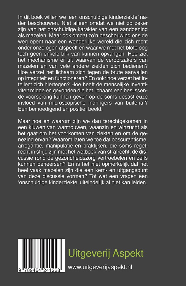 In dit boek willen we ‘een onschuldige kinderziekte’ nader beschouwen. Niet alleen omdat we niet zo zeker zijn van het onschuldige karakter van een aandoening als mazelen. Maar ook omdat zo’n beschouwing ons de weg opent naar een wonderlijke wereld die zich recht onder onze ogen afspeelt en waar we met het blote oog toch geen enkele blik van kunnen opvangen. Hoe ziet het mechanisme er uit waarvan de veroorzakers van mazelen en van vele andere ziekten zich bedienen? Hoe verzet het lichaam zich tegen de brute aanvallen op integriteit en functioneren? En ook: hoe verzet het intellect zich hiertegen? Hoe heeft de menselijke inventiviteit middelen gevonden die het lichaam een beslissende voorsprong kunnen geven op de soms desastreuze invloed van microscopische indringers van buitenaf? Een bemoedigend en positief beeld.
