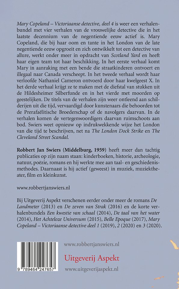 Mary Copeland - Victoriaanse detective, deel 4 is weer een verhalenbundel met vier verhalen van de vrouwelijke detective die in het laatste decennium van de negentiende eeuw actief is. Mary Copeland, die bij haar oom en tante in het london van de late negentiende eeuw opgroeit en zich ontwikkelt tot een detective van allure, werkt onder meer in opdracht van Scotland Yard en heeft haar eigen team tot haar beschikking. In het eerste verhaal komt Mary in aanraking met een bende die straatkinderen ontvoerd en illegaal naar Canada verscheept. In het tweede deel verhaal wordt haar verloofde Nathaniel Cameron ontvoerd door haar kwelgeest X. In het derde deel verhaal krijgt ze te maken met de diefstal van stukken uit de Hildesheimer Silberfunde en in het vierde met moorden op geestelijken. De titels van de verhalen zijn weer ontleend aan de schilderijen uit die tijd, vervaardigd door de kunstenaars die behoorden tot de Prerafaëlitische Broederschap of de navolgers daarvan. In de verhalen komen de vertegenwoordigers daarvan ruimschoots aan bod. Swiers weet opnieuw op indrukwekkende wijze het London van die tijd te beschrijven, net na The London Dock Strike en The Cleveland Street Scandal.