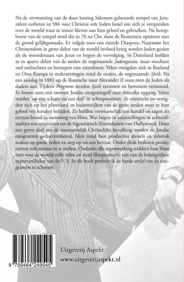 In 'Joods Hollywood' schetst de auteur de harde strijd van Joodse emigranten in de V.S. Velen maakten ‘op een schoen en een slof’ in scheepsruimen de overtocht. Ze vestigden zich op het platteland en buitenwijken van de grote steden waar ze hun geloof vrij konden belijden. Ze leefden voornamelijk van handel en zagen als eersten brood in de vertoning van films. Wat begon in voorstellingen in achterafzaaltjes, zou uitgroeien tot de legendarische filmindustrie van Hollywood.