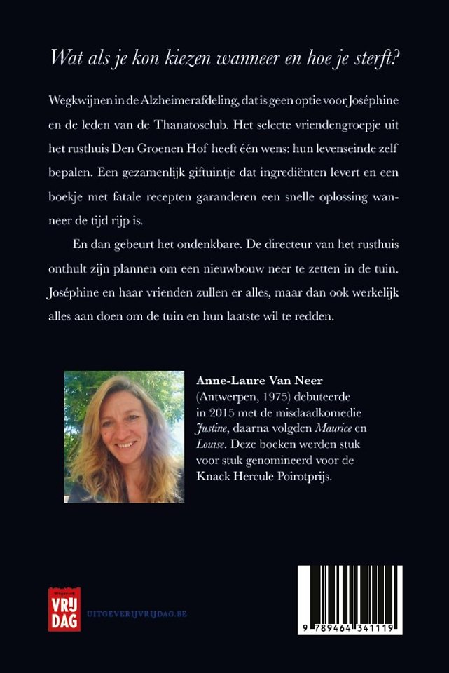Wegkwijnen in de Alzheimerafdeling, dat is geen optie voor Joséphine en de leden van de Thanatosclub. Het selecte vriendengroepje uit het woonzorgcentrum Den Groenen heeft één wens: hun levenseinde zelf bepalen. Een gezamenlijk giftuintje dat ingrediënten levert en een boekje met fatale recepten garanderen een snelle oplossing wanneer de tijd rijp is. En dan gebeurt het ondenkbare. De directeur van het woonzorgcentrum onthult zijn plannen om een nieuwbouw neer te zetten in de tuin. Joséphine en haar vrienden zullen er alles, maar dan ook werkelijk alles aan doen om de tuin en hun laatste wil te redden.