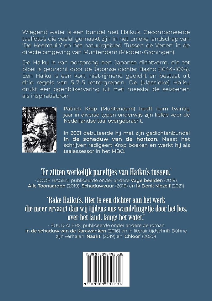 Wiegend water is een bundel met Haiku’s. Gecomponeerde taalfoto’s die veelal gemaakt zijn in het unieke landschap van ‘De Heemtuin’ en het natuurgebied ‘Tussen de Venen’ in de directe omgeving van Muntendam (Midden-Groningen).