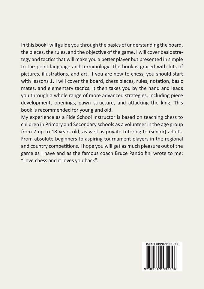 In this book I will guide you through the basics of understanding the board, the pieces, the rules, and the objective of the game. I will cover basic strategy and tactics that will make you a better player but presented in simple to the point language and terminology. The book is graced with lots of pictures, illustrations, and art. If you are new to chess, you should start with lessons 1. I will cover the board, chess pieces, rules, notation, basic mates, and elementary tactics. It then takes you by the hand and leads you through a whole range of more advanced strategies, including piece development, openings, pawn structure, and attacking the king. This book is recommended for young and old.My experience as a Fide School Instructor is based on teaching chess to children in Primary and Secondary schools as a volunteer in the age group from 7 up to 18 years old, as well as private tutoring to (senior) adults. From absolute beginners to aspiring tournament players in the regional and country competitions. I hope you will get as much pleasure out of the game as I have and as the famous coach Bruce Pandolfini wrote to me: “Love chess and it loves you back”.