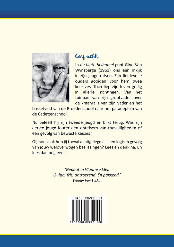 In de blote belhamel gunt Gino Van Wynsberge (1961) ons een inkijk in zijn jeugdfratsen. Zijn liefdevolle ouders gooiden voor hem twee keer zes. Toch liep zijn leven grillig in allerlei richtingen. Van het tuinpad van zijn grootvader over de kraanrails van zijn vader en het basketveld van de Broederschool naar het paradeplein van de Cadettenschool.