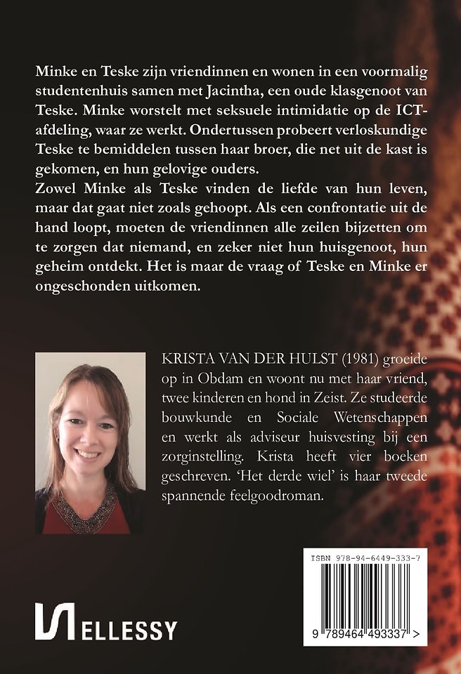 Krista van der Hulst (1981) groeide op in Obdam en woont nu met haar vriend, twee kinderen en hond in Zeist. Ze studeerde bouwkunde en Sociale Wetenschappen en werkt als adviseur huisvesting bij een zorginstelling. Krista heeft vier boeken geschreven. ‘Het derde wiel’ is haar tweede spannende feelgoodroman.