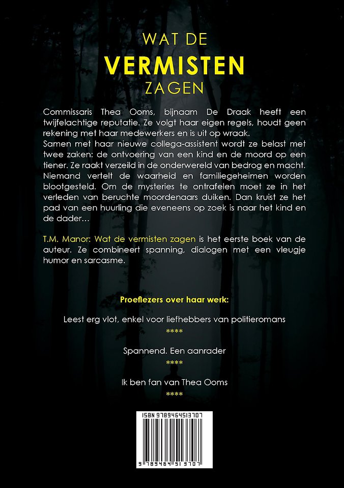 Commissaris Thea Ooms, bijnaam De Draak heeft een twijfelachtige reputatie. Ze volgt haar eigen regels, houdt geen rekening met haar medewerkersen is uit op wraak. Samen met haar nieuwe collega-assistent wordt ze belast met twee zaken: de ontvoering van een kind en de moord op een tiener. Ze raakt verzeild in de onderwereld van bedrog enmacht. Niemand vertelt de waarheid en familiegeheimen worden blootgesteld. Om de mysteries te ontrafelen moet ze in het verleden van beruchte moordenaars duiken. Dan kruist ze het pad van een huurling die eveneens op zoek is naar het kind en de dader…