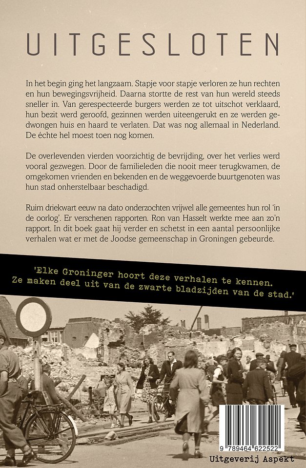 In het begin ging het langzaam. Stapje voor stapje verloren ze hun rechten en hun bewegingsvrijheid. Daarna stortte de rest van hun wereld steeds sneller in. Van gerespecteerde burgers werden ze tot uitschot verklaard, hun bezit werd geroofd, gezinnen werden uiteengerukt en ze werden gedwongen huis en haard te verlaten. Dat was nog allemaal in Nederland. De échte hel moest toen nog komen. De overlevenden vierden voorzichtig de gewonnen oorlog, over de verloren oorlog werd vooral gezwegen. Door de familieleden die nooit meer terugkwamen, de omgekomen vrienden en bekenden en de weggevoerde buurtgenoten was hun stad onherstelbaar beschadigd. Ruim driekwart eeuw na dato onderzochten vrijwel alle gemeentes hun rol ‘in de oorlog’. Er verschenen rapporten. Ron van Hasselt werkte mee aan zo’n rapport. In dit boek gaat hij verder en schetst in een aantal persoonlijke verhalen wat er met de Joodse gemeenschap in Groningen gebeurde.