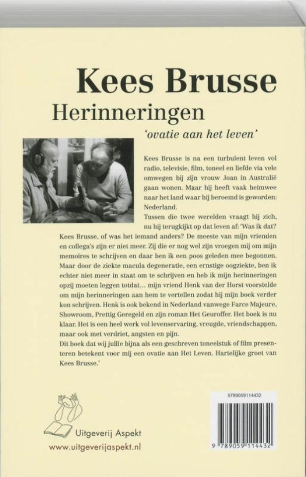 Een hele generatie televisiekijkers is opgegroeid met Kees Brusse en heeft genoten van de vele onvergetelijke series waarin hij het middelpunt vormde. Hoog tijd dan ook voor zijn Herinneringen, ovatie aan het leven waarin al zijn acteursprestaties de revue passeren. Kees Brusse is na een turbulent leven vol radio, televisie, film en toneel en liefde via vele omwegen in Australië gaan wonen, maar heeft vaak heimwee naar het land waar hij beroemd is geworden: Nederland. Tussen die twee werelden kijkt hij nu terug op dat leven waarin hij telkens iemand anders was. Op verzoek vertelde hij zijn herinneringen aan zijn goede vriend Henk van der Horst, die hem hielp bij de totstandkoming van het boek.