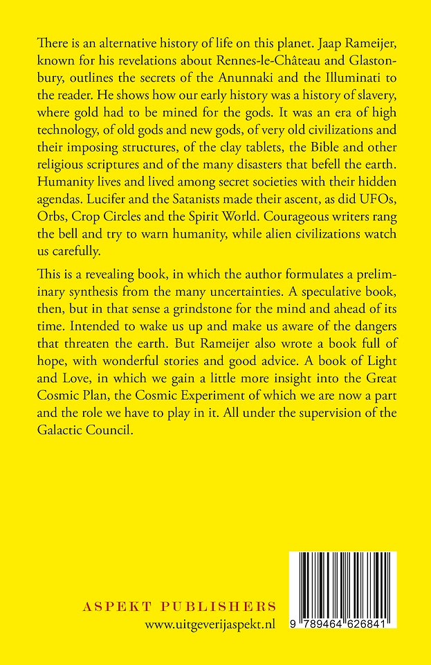 There is an alternative history of life on this planet. Jaap Rameijer, known for his revelations about Rennes-le-Château and Glastonbury, outlines the secrets of the Anunnaki and the Illuminati to the reader. He shows how our early history was a history of slavery, where gold had to be mined for the gods. It was an era of high technology, of old gods and new gods, of very old civilizations and their imposing structures, of the clay tablets, the Bible and other religious scriptures and of the many disasters that befell the earth. Humanity lives and lived among secret societies with their hidden agendas. Lucifer and the Satanists made their ascent, as did UFOs, Orbs, Crop Circles and the Spirit World. Courageous writers rang the bell and try to warn humanity, while alien civilizations watch us carefully.