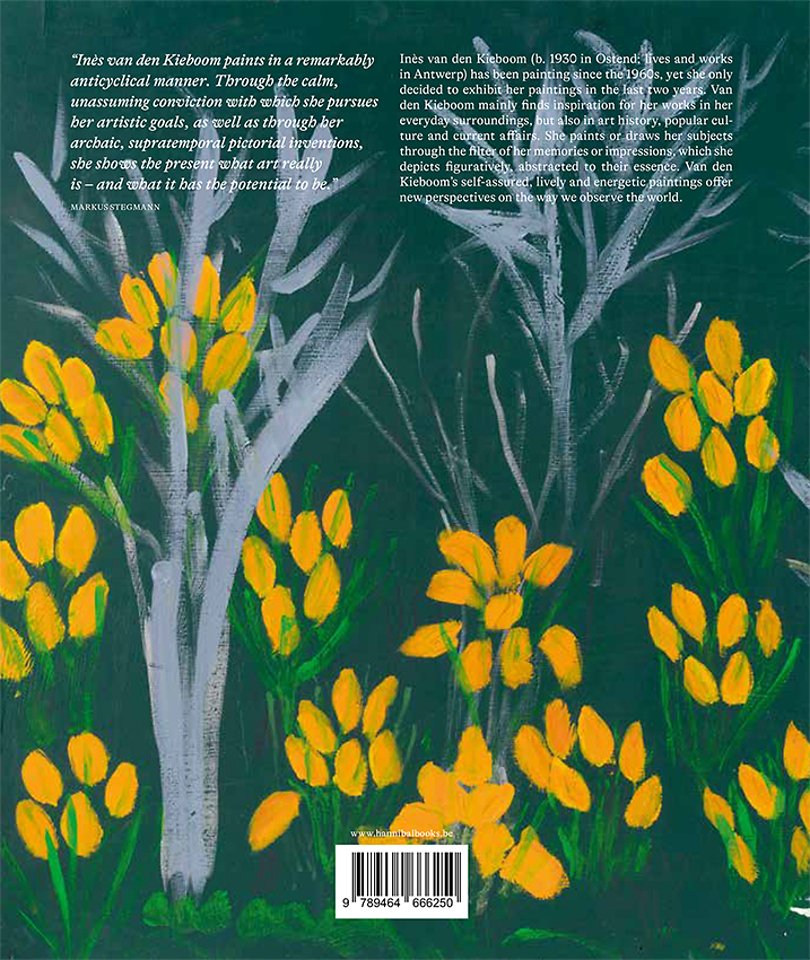 Inès Van den Kieboom (°1930 in Oostende; woont en werkt in Antwerpen) maakt al schilderijen sinds 1960, maar besliste pas de laatste twee jaar om haar werk tentoon te stellen. Van den Kieboom vindt voor haar werken vooral inspiratie in haar dagelijkse omgeving, maar ook in de kunstgeschiedenis, de populaire cultuur en de actualiteit. Haar onderwerpen schildert of tekent ze door een filter van herinneringen en indrukken die ze figuratief weergeeft, geabstraheerd tot hun essentie. Van den Kiebooms schilderijen zijn zelfverzekerd, geanimeerd en energiek, en bieden nieuwe perspectieven op de manier waarop we de wereld observeren.