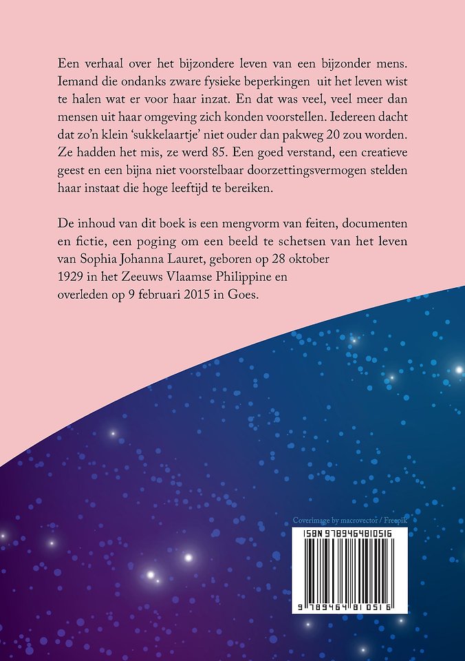 Dit is het geromantiseerde levensverhaal over het leven van mijn oudste zus, Sophia, Johanna Lauret, geboren op 28 oktober 1929 in Philippine en overleden op 9 februari 2015 in Goes. Ze kwam 2 maanden te vroeg ter wereld. Door zuurstoftekort raakten haar hersenen beschadigd met als gevolg: blijvende spasticiteit en ernstige spraakstoornis. Omstreeks haar zestigste levensjaar kwam daar het Syndroom van Guillain Barré overheen, waardoor ze totaal verlamd raakte. Enkel haar hoofd kon ze nog bewegen. Ze had een goed verstand, een creatieve geest en een nauwelijks te bevatten doorzettingsvermogen.