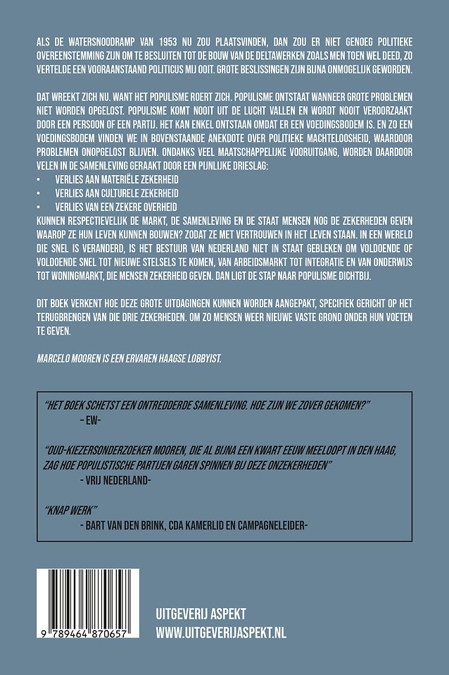 Kunnen respectievelijk de markt, de samenleving en de Staat mensen nog de zekerheden geven waarop ze hun leven kunnen bouwen? Zodat ze met vertrouwen in het leven staan. In een wereld die snel is veranderd, is het bestuur van Nederland niet in staat gebleken om voldoende of voldoende snel tot nieuwe stelsels te komen, van arbeidsmarkt tot integratie en van onderwijs tot woningmarkt, die mensen zekerheid geven. Dan ligt de stap naar populisme dichtbij.