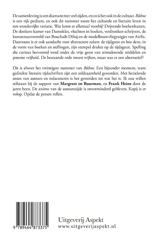 Dit is alweer het twintigste nummer van Bühne. Een bijzonder moment, want gedrukte literaire tijdschriften zijn een zeldzaamheid geworden. Met bezielende steun van auteurs en redacteuren is het geworden tot wat het is. Ik zou willen stilstaan bij de support van Margreet en Buurman, en Frank Heine door de jaren heen. De animo van de auteurszijde is onverminderd gebleven. Kopij is er volop. Opdat de persen rollen.