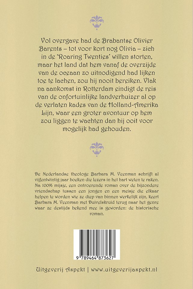 De Nederlandse theologe Barbara M. Veenman schrijft al vijfentwintig jaar boeken die lezers in het hart weten te raken. Na 100% mijsje, een ontroerende roman over de bijzondere vriendschap tussen een jongen en een meisje die elkaar helpen te worden wie ze diep van binnen werkelijk zijn, keert Barbara M. Veenman met Duivelskruid terug naar het genre waar ze destijds bekend mee is geworden: de historische roman.