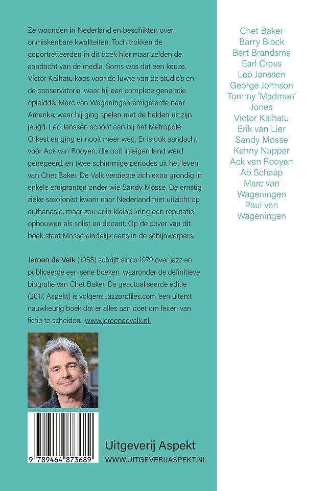 Ze woonden in Nederland en beschikten over onmiskenbare kwaliteiten. Toch trokken de geportretteerden in dit boek hier maar zelden de aandacht van de media. Soms was dat een keuze. Victor Kaihatu koos voor de luwte van de studio’s en de conservatoria, waar hij een complete generatie opleidde. Marc van Wageningen emigreerde naar Amerika, waar hij ging spelen met de helden uit zijn jeugd. Leo Janssen schoof aan bij het Metropole Orkest en ging er nooit meer weg. Er is ook aandacht voor Ack van Rooyen, die ooit in eigen land werd genegeerd, en twee schimmige periodes uit het leven van Chet Baker. De Valk verdiepte zich extra grondig in enkele emigranten onder wie Sandy Mosse. De ernstig zieke saxofonist kwam naar Nederland met uitzicht op euthanasie, maar zou er in kleine kring een reputatie opbouwen als solist en docent. Op de cover van dit boek staat Mosse eindelijk eens in de schijnwerpers.