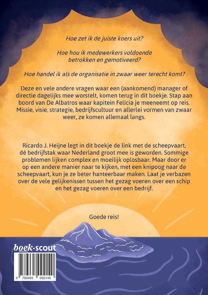 Deze en vele andere vragen waar een (aankomend) manager of directie dagelijks mee worstelt, komen terug in dit boekje. Stap aan boord van De Albatros waar kapitein Felicia je meeneemt op reis. Missie, visie, strategie, bedrijfscultuur en allerlei vormen van zwaar weer, ze komen allemaal langs. Ricardo Heijne legt in dit boekje de link met de scheepvaart, dé bedrijfstak waar Nederland groot mee is geworden.