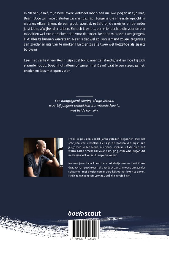In Ik heb je lief, mijn hele leven ontmoet Kevin een nieuwe jongen in zijn klas, Dean. Door zijn moed sluiten zij vriendschap. Jongens die in het eerste opzicht in niets op elkaar lijken, de een groot, sportief en geliefd bij de meisjes en de andere juist klein, afwijkend en alleen. En toch is er iets, een vriendschap die voor de een misschien wel meer betekent dan voor de ander. De band van deze twee jongens lijkt alles te kunnen doorstaan. Maar is dat wel zo, kan iemand zoveel tegenslag aan zonder er iets van te merken? En als zij iets beleven, ervaren zij hetzelfde? Wat doet het verleden met je, hoe sterk kun je zijn of worden door dat wat je overkomt?
