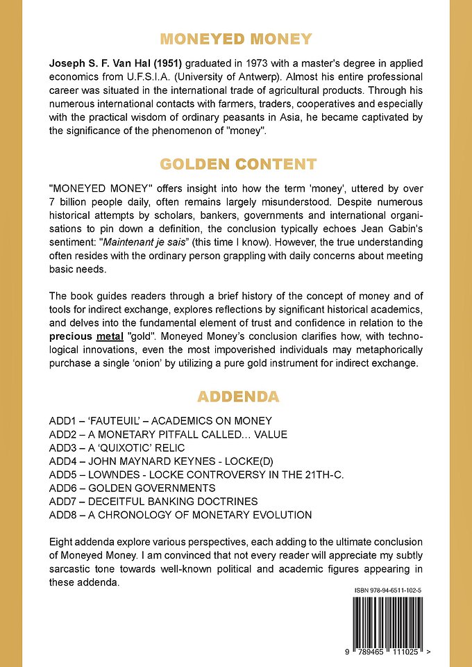 The book guides readers through a brief history of the concept of money, explores reflections by significant historical academics, and delves into the fundamental element of trust and confidence in relation to the precious metal "gold". Moneyed Money’s conclusion clarifies how, with technological innovations, even the most impoverished individuals may metaphorically purchase a single ‘onion’ by utilizing a pure gold instrument for indirect exchange.