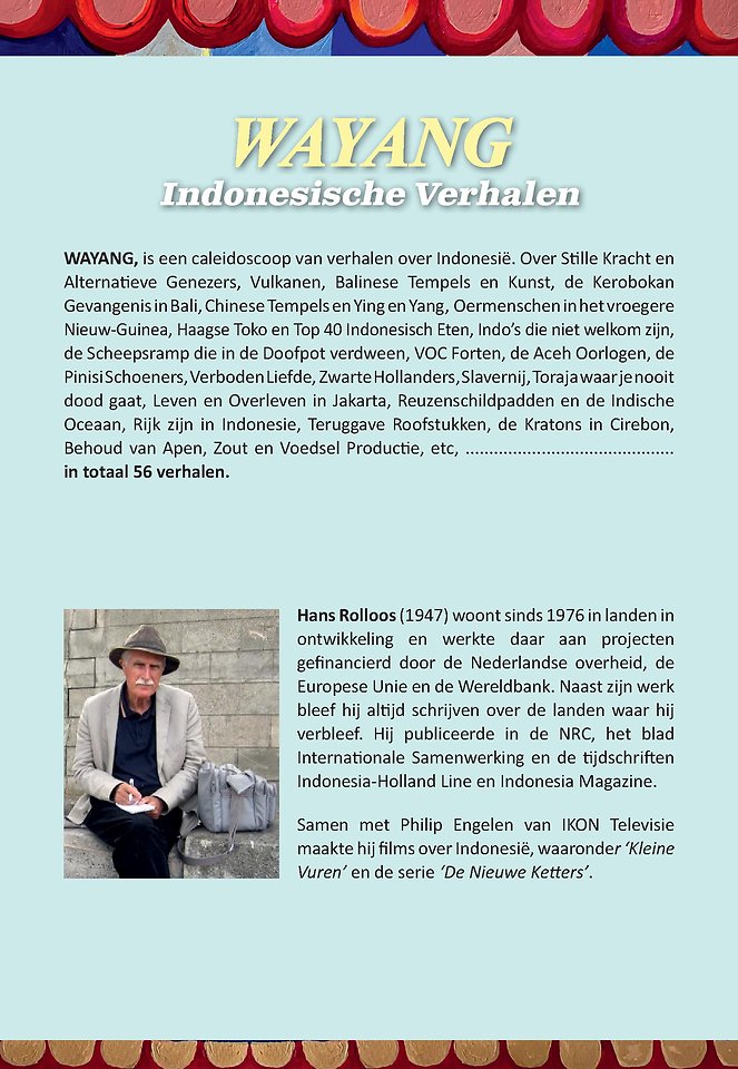 WAYANG, is een caleidoscoop van verhalen over Indonesië. Over Stille Kracht en Alternatieve Genezers, Vulkanen, Balinese Tempels en Kunst, de Kerobokan Gevangenis in Bali, Chinese Tempels en Ying en Yang, Oermenschen in het vroegere Nieuw-Guinea, Haagse Toko en Top 40 Indonesisch Eten, Indo’s die niet welkom zijn, de Scheepsramp die in de Doofpot verdween, VOC Forten, de Aceh Oorlogen, de Pinisi Schoeners, Verboden Liefde, Zwarte Hollanders, Slavernij, Toraja waar je nooit dood gaat, Leven en Overleven in Jakarta, Reuzenschildpadden en de Indische Oceaan, Rijk zijn in Indonesie, Teruggave Roofstukken, de Kratons in Cirebon, Behoud van Apen, Zout en Voedsel Productie, etc, ……………………………………… in totaal 56 verhalen.