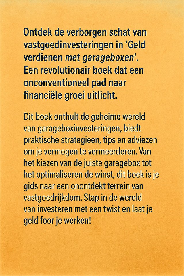 Ontdek de verborgen schat van vastgoedinvesteringen in 'Geld verdienen met garage boxen'. Een revolutionair boek dat een onconventioneel pad naar financiële groei uitlicht. Dit boek onthult de geheime wereld van garage box investeringen, biedt praktische strategieën, tips en adviezen om je vermogen te vermeerderen. Van het kiezen van de juiste garage box tot het optimaliseren van de winst, dit boek is je gids naar een onontdekt terrein van vastgoedrijkdom. Stap in de wereld van investeren met een twist en laat je geld voor je werken!
