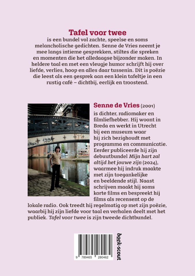 Tafel voor twee is een bundel vol zachte, speelse en soms melancholische gedichten. Senne de Vries neemt je mee langs intieme gesprekken, stiltes die spreken en momenten die het alledaagse bijzonder maken. In heldere taal en met een vleugje humor schrijft hij over liefde, verlies, hoop en alles daar tussenin. Dit is poëzie die leest als een gesprek aan een klein tafeltje in een rustig café – dichtbij, eerlijk en troostend.