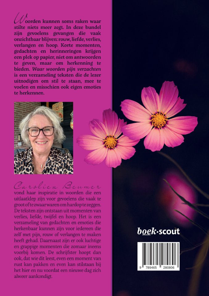 Woorden kunnen soms raken waar stilte niets meer zegt. In deze bundel zijn gevoelens gevangen die vaak onzichtbaar blijven: rouw, liefde, verlies, verlangen en hoop. Korte momenten, gedachten en herinneringen krijgen een plek op papier, niet om antwoorden te geven, maar om herkenning te bieden. Waar woorden pijn verzachten is een verzameling teksten die de lezer uitnodigen om stil te staan, mee te voelen en misschien ook eigen emoties te herkennen.