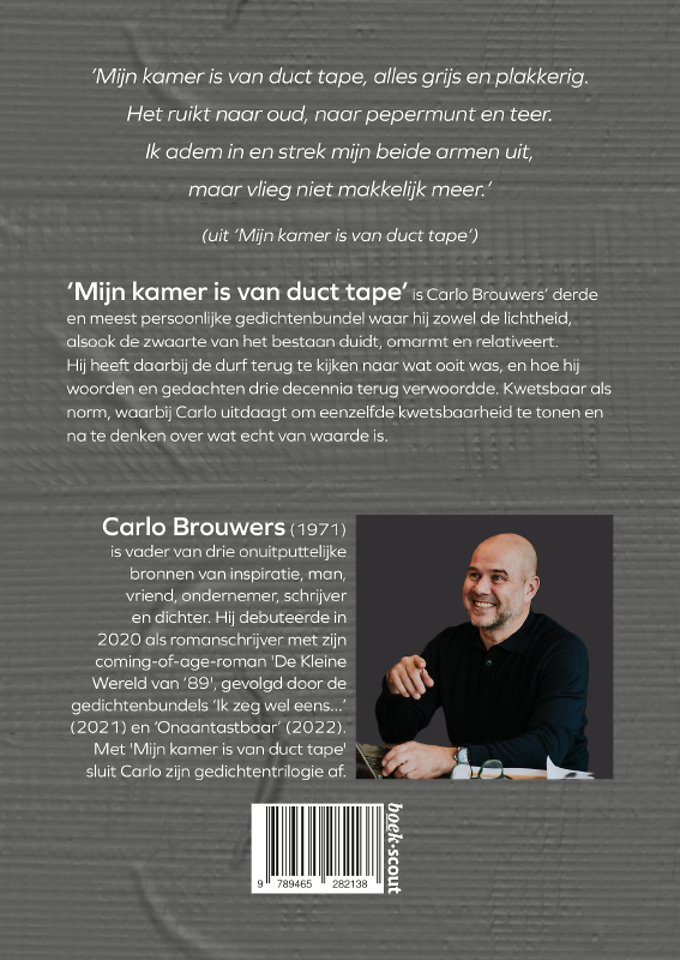‘Mijn kamer is van duct tape’ is Carlo Brouwers’ derde en meest persoonlijke gedichtenbundel waar hij zowel de lichtheid, alsook de zwaarte van het bestaan duidt, omarmt en relativeert. Hij heeft daarbij de durf terug te kijken naar wat ooit was, en hoe hij woorden en gedachten drie decennia terug verwoordde. Kwetsbaar als norm, waarbij Carlo uitdaagt om eenzelfde kwetsbaarheid te tonen en na te denken over wat echt van waarde is.