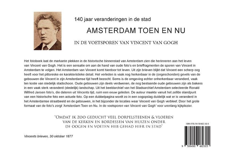 Het fotoboek laat de markante plekken in de historische binnenstad van Amsterdam zien die herinneren aan het leven van Vincent van Gogh. Het is een sensatie om aan de hand van oude foto’s en brieffragmenten de sporen van Vincent in Amsterdam te volgen. Het Amsterdam van Vincent komt hierdoor tot leven. Uit zijn brieven blijkt dat Vincent een scherp oog heeft voor het pittoreske en karakteristieke detail. Het verleden is vaak nog herkenbaar in de (ongeschonden) gevels van de gebouwen die Vincent in zijn Amsterdamse tijd heeft bezocht. Soms is de omgeving echter onherkenbaar veranderd, vaak ten koste van stedelijk stadsschoon. Oude gebouwen zijn deels verdwenen, de nog bestaande oude gebouwen zijn als bakens in een vaak sterk veranderd (stedelijk) landschap. Uit het beeldarchief van het Stadsarchief Amsterdam selecteerde Ronald Wilfred Jansen foto’s, die dateren uit Vincents tijd, ruim een eeuw geleden. De auteur maakte vanuit het zelfde standpunt van een historische foto een actuele foto. Op een dubbelpagina wordt zo in een oogopslag duidelijk wat er is veranderd in het Amsterdamse straatbeeld en de gebouwen, in het bijzonder de locaties waar Vincent van Gogh verbleef. Door het grote formaat van de foto’s zorgt ‘Amsterdam Toen en Nu. In de voetsporen van Vincent van Gogh’ voor urenlang kijkplezier.