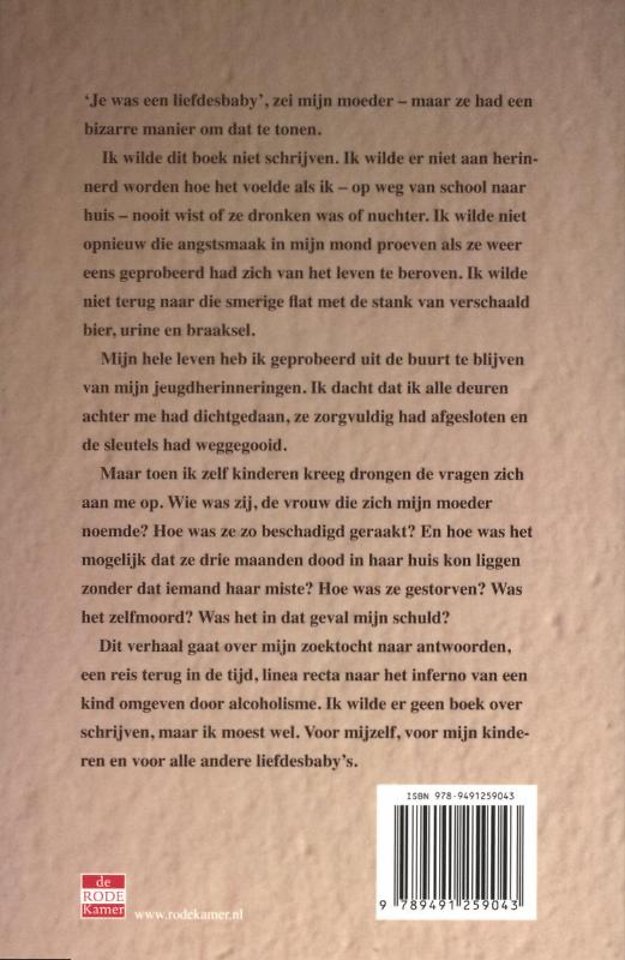 Dit verhaal gaat over mijn zoektocht naar antwoorden, een reis terug in de tijd, linea recta naar het inferno van een kind omgeven door alcoholisme. Ik wilder er geen boek over schrijven, maar ik moest wel. Voor mijzelf, voor mijn kinderen en voor alle andere liefdesbabys.