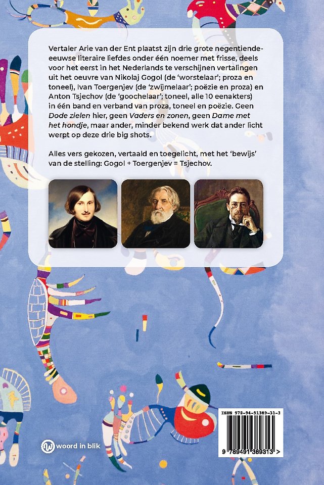 Vertaler Arie van der Ent plaatst zijn drie grote negentiende-eeuwse literaire liefdes onder één noemer met frisse, deels voor het eerst in het Nederlands te verschijnen vertalingen uit het rijke oeuvre van Nikoláj Gógol (de 'worstelaar'; proza en toneel), Ivan Toergénjev (de 'zwijmelaar'; poëzie en proza) en Antón Tsjéchov (de 'goochelaar'; toneel, alle 9 eenakters) in één band en verband van proza, toneel en poëzie. Geen Dode zielen hier, geen Vaders en zonen, geen Dame met het hondje, maar ander, minder bekend werk dat ander licht werpt op de drie kanonnen. Kakelvers vertaald, met situering en toelichting van elke afzonderlijke tekst.