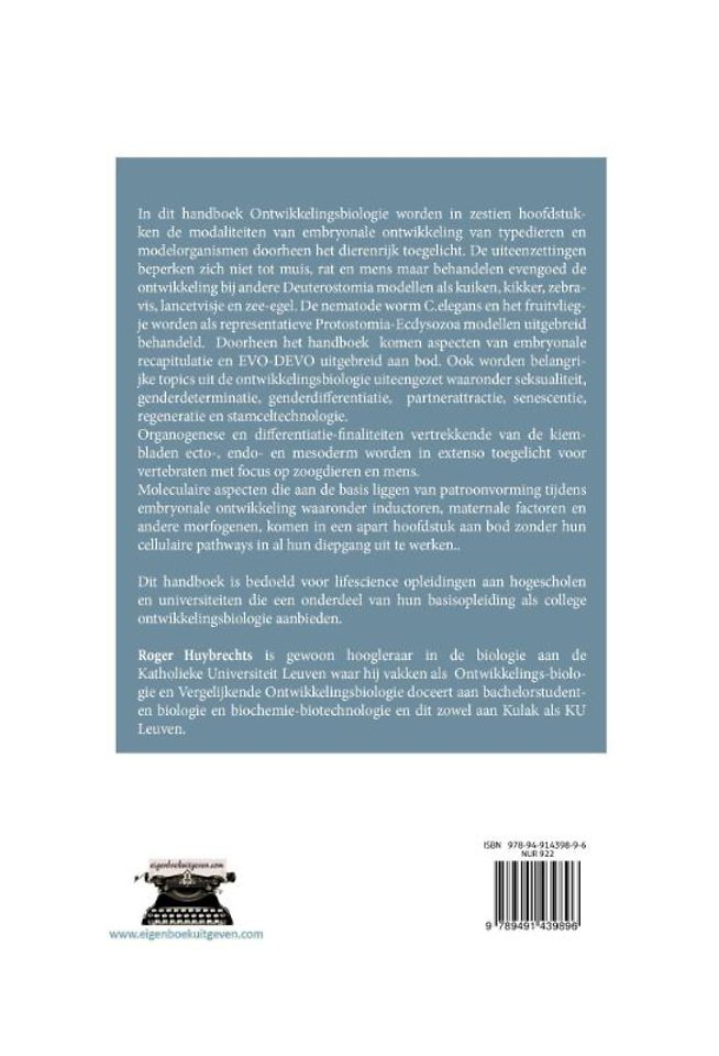 In dit handboek Ontwikkelingsbiologie worden in zestien hoofdstukken de modaliteiten van embryonale ontwikkeling van typedieren en modelorganismen doorheen het dierenrijk toegelicht. De uiteenzettingen beperken zich niet tot muis, rat en mens maar behandelen evengoed de ontwikkeling bij andere Deuterostomia modellen als kuiken, kikker, zebravis, lancetvisje en zee-egel. De nematode worm C.elegans en het holometabole fruitvliegje worden als representatieve Protostomia-Ecdysozoa modellen uitgebreid behandeld en aangevuld met info omtrent ontwikkeling bij heterometabole hemipteren als wants en sprinkhaan. Ook de evolutie van embryonale vliezen bij hexapoda komt aan bod.