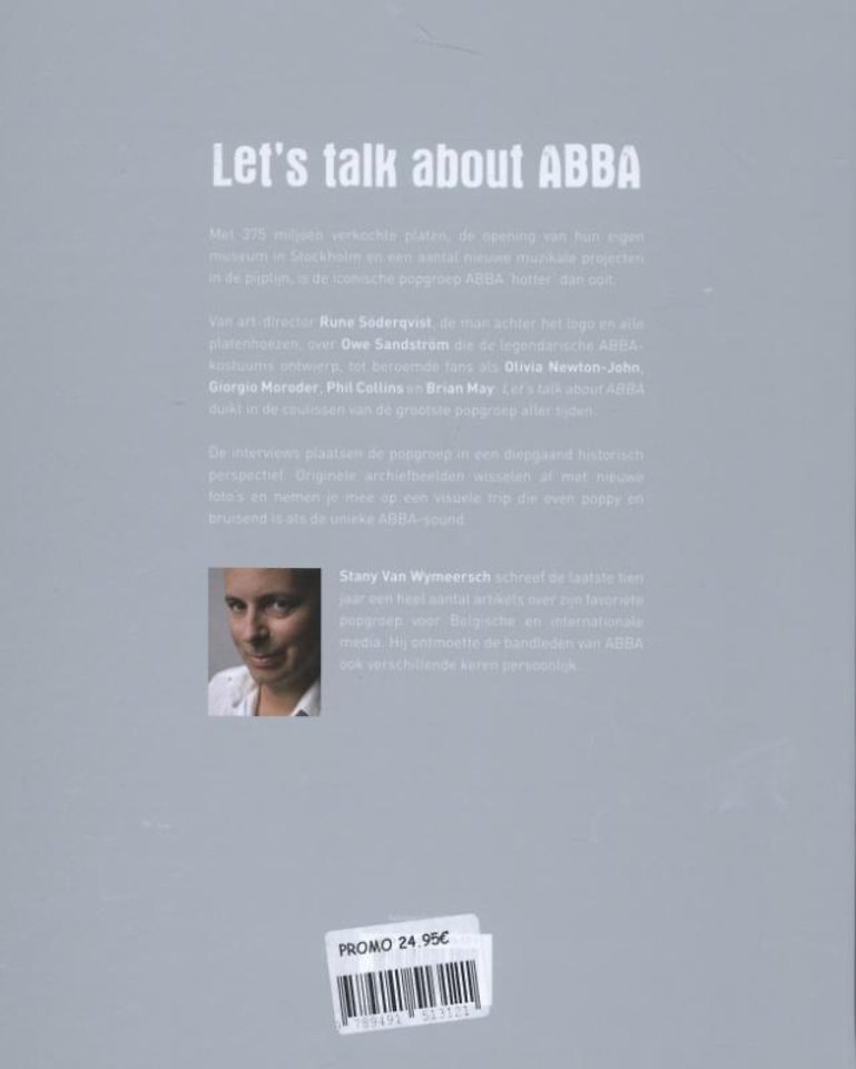 Met 375 miljoen verkochte albums, een nieuw museum in Stockholm en de pas aangekondigde comeback van Agnetha Fältskog is ABBA nog altijd hotter dan hot. Let's talk about ABBA is het verhaal van de iconische popgroep verteld door mensen uit hun directe entourage. Art director Rune Söderqvist, die het logo en alle platenhoezen van ABBA ontwierp, Little Gerhard, de ontdekker van Agnetha Fältskog, en Owe Sandström, de ontwerper van de legendarische ABBA-kostuums, zijn enkele van de insiders die in een reeks exclusieve gesprekken uitgebreid aan het woord komen. Het boek bevat tevens een interview met Björn Ulvaeus en getuigenissen van de andere ABBA-leden. Ook muzikale zijprojecten zoals MAMMA MIA! en de comeback van Agnetha komen aan bod. Tot slot lichten sterren zoals operazangeres Anne-Sofi e von Otter, producer Giorgio Moroder (die recent nog meewerkte aan het nieuwste album van Daft Punk), songwriter Neil Sedaka en punkicoon Plastic Bertrand een tipje van de sluier op van ABBA's monstersucces. De meer dan 40 exclusieve en onthullende interviews zijn geïllustreerd met nooit of zelden gepubliceerde beelden en foto's van vroeger tot nu. Stany Van Wijmeersch schreef de laatste tien jaar verschillende artikels over zijn favoriete popgroep voor Belgische en internationale media. Hij ontmoette de bandleden van ABBA ook verschillende keren persoonlijk.