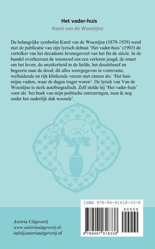 De belangrijke symbolist Karel van de Woestijne (1878-1929) werd met de publicatie van zijn lyrisch debuut 'Het vader-huis' (1903) de vertolker van het decadente levensgevoel van het fin de siècle. In de bundel overheersen de weemoed om een verloren jeugd, de smart om het leven, de onzekerheid in de liefde, het doodsbesef en begeerte naar de dood; dit alles weergegeven in vormvaste, welluidende en rijk klinkende verzen met zinnen als: 'Het huis mijns vaders, waar de dagen trager waren'. De lyriek van Van de Woestijne is sterk autobiografisch. Zelf stelde hij 'Het vader-huis' voor als 'het boek van mijn poëtische ontroeringen, toen ik nog onder het ouderlijk dak woonde'.