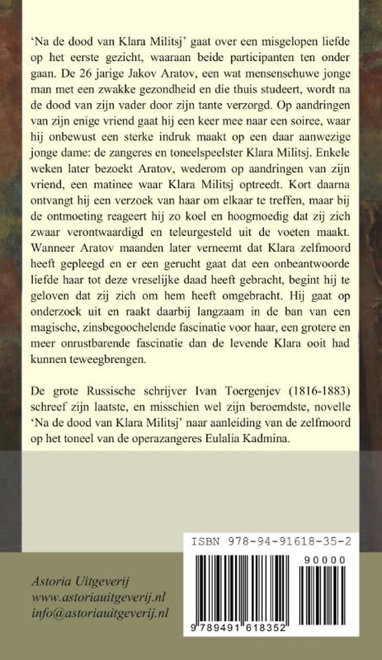 'Na de dood van Klara Militsj' gaat over een misgelopen liefde op het eerste gezicht, waaraan beide participanten ten onder gaan. De 26 jarige Jakov Aratov, een wat mensenschuwe jonge man met een zwakke gezondheid en die thuis studeert, wordt na de dood van zijn vader door zijn tante verzorgd. Op aandringen van zijn enige vriend gaat hij een keer mee naar een soiree, waar hij onbewust een sterke indruk maakt op een daar aanwezige jonge dame: de zangeres en toneelspeelster Klara Militsj. Enkele weken later bezoekt Aratov, wederom op aandringen van zijn vriend, een matinee waar Klara Militsj optreedt. Kort daarna ontvangt hij een verzoek van haar om elkaar te treffen, maar bij de ontmoeting reageert hij zo koel en hoogmoedig dat zij zich zwaar verontwaardigd en teleurgesteld uit de voeten maakt. Wanneer Aratov maanden later verneemt dat Klara zelfmoord heeft gepleegd en er een gerucht gaat dat een onbeantwoorde liefde haar tot deze vreselijke daad heeft gebracht, begint hij te geloven dat zij zich om hem heeft omgebracht. Hij gaat op onderzoek uit en raakt daarbij langzaam in de ban van een magische, zinsbegoochelende fascinatie voor haar, een grotere en meer onrustbarende fascinatie dan de levende Klara ooit had kunnen teweegbrengen.