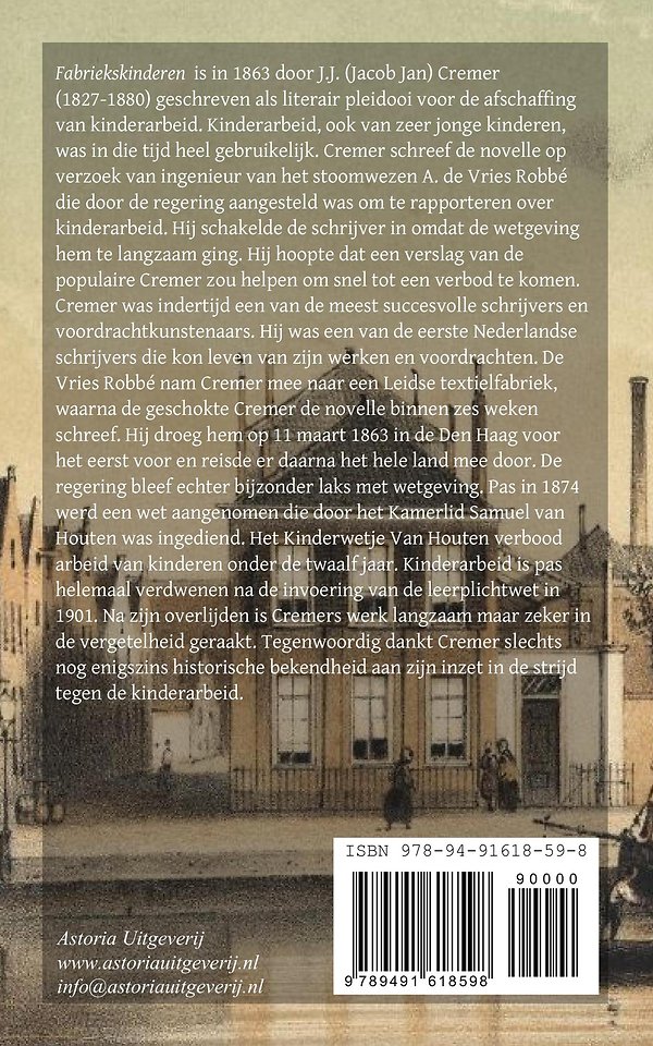 Fabriekskinderen is in 1863 door J.J. (Jacob Jan) Cremer (1827-1880) geschreven als literair pleidooi voor de afschaffing van kinderarbeid. Kinderarbeid, ook van zeer jonge kinderen, was in die tijd heel gebruikelijk. Cremer schreef de novelle op verzoek van ingenieur van het stoomwezen A. de Vries Robbé die door de regering aangesteld was om te rapporteren over kinderarbeid. Hij schakelde de schrijver in omdat de wetgeving hem te langzaam ging. Hij hoopte dat een verslag van de populaire Cremer zou helpen om snel tot een verbod te komen. Cremer was indertijd een van de meest succesvolle schrijvers en voordrachtkunstenaars. Hij was een van de eerste Nederlandse schrijvers die kon leven van zijn werken en voordrachten. De Vries Robbé nam Cremer mee naar een Leidse textielfabriek, waarna de geschokte Cremer de novelle binnen zes weken schreef. Hij droeg hem op 11 maart 1863 in de Den Haag voor het eerst voor en reisde er daarna het hele land mee door. De regering bleef echter bijzonder laks met wetgeving. Pas in 1874 werd een wet aangenomen die door het Kamerlid Samuel van Houten was ingediend. Het Kinderwetje Van Houten verbood arbeid van kinderen onder de twaalf jaar. Kinderarbeid is pas helemaal verdwenen na de invoering van de leerplichtwet in 1901. Na zijn overlijden is Cremers werk langzaam maar zeker in de vergetelheid geraakt. Tegenwoordig dankt Cremer slechts nog enigszins historische bekendheid aan zijn inzet in de strijd tegen de kinderarbeid.