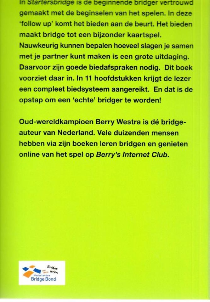 In het boek Startersbridge (isbn978-94-91092-00-8) is de beginnende bridger vertrouwd gemaakt met de beginselen van het spelen. In deze 'follow up' komt het bieden aan de beurt. Het bieden maakt bridge tot een bijzonder kaartspel. Nauwkeurig kunnen bepalen hoeveel slagen je samen met je partner kunt maken is een enorme uitdaging. Daarvoor zijn goede biedafspraken nodig. Dit boek voorziet daarin. In 11 hoofdstukken krijgt de lezer een compleet biedsysteem aangereikt. En dat is de opstap om een 'echte' bridger te worden.