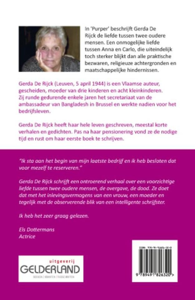 In 'Purper' beschrijft Gerda De Rijck de liefde tussen twee oudere mensen. Een onmogelijke liefde tussen Anna en Carlo, die uiteindelijk toch sterker blijkt dan alle praktische bezwaren, religieuze achtergronden en maatschappelijke hindernissen.