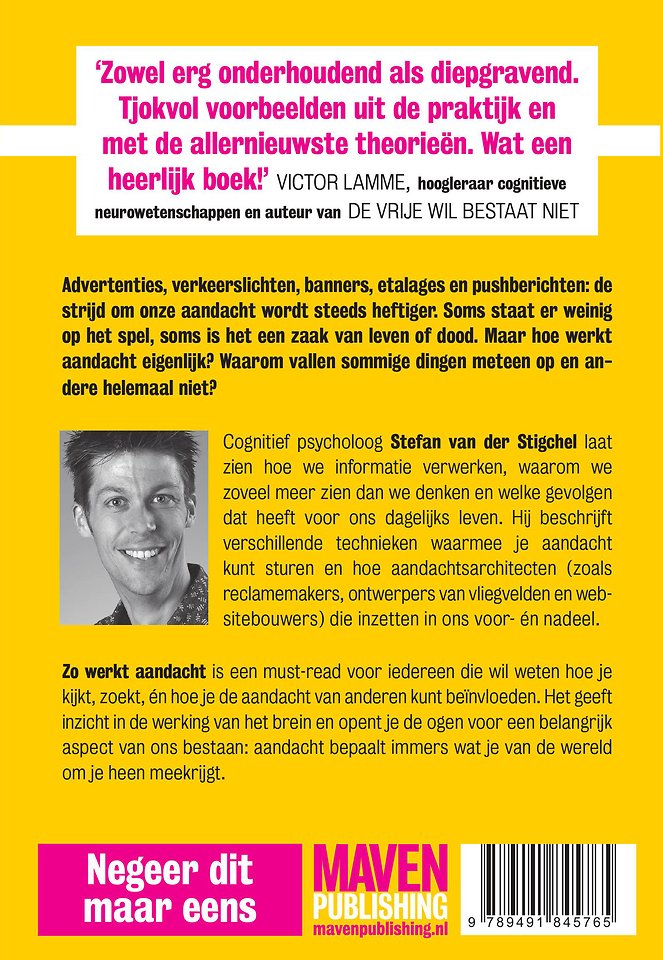 We denken dat we een gedetailleerde en stabiele wereld zien, maar dit is slechts een illusie, veroorzaakt door de manier waarop onze hersenen visuele informatie verwerken. Dit heeft belangrijke gevolgen voor de manier waarop je informatie moet aanbieden. Stefan van der Stigchels Zo werkt aandacht gaat over opvallen, kijken en zoeken in een wereld vol afleiding.