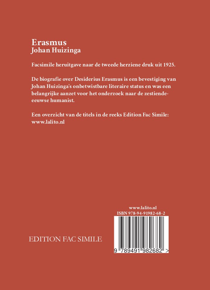 Facsimile heruitgave naar de tweede herziene druk uit 1925. De biografie over Desiderius Erasmus is een bevestiging van Johan Huizinga's onbetwistbare literaire status en was een belangrijke aanzet voor het onderzoek naar de zestiende-eeuwse humanist.