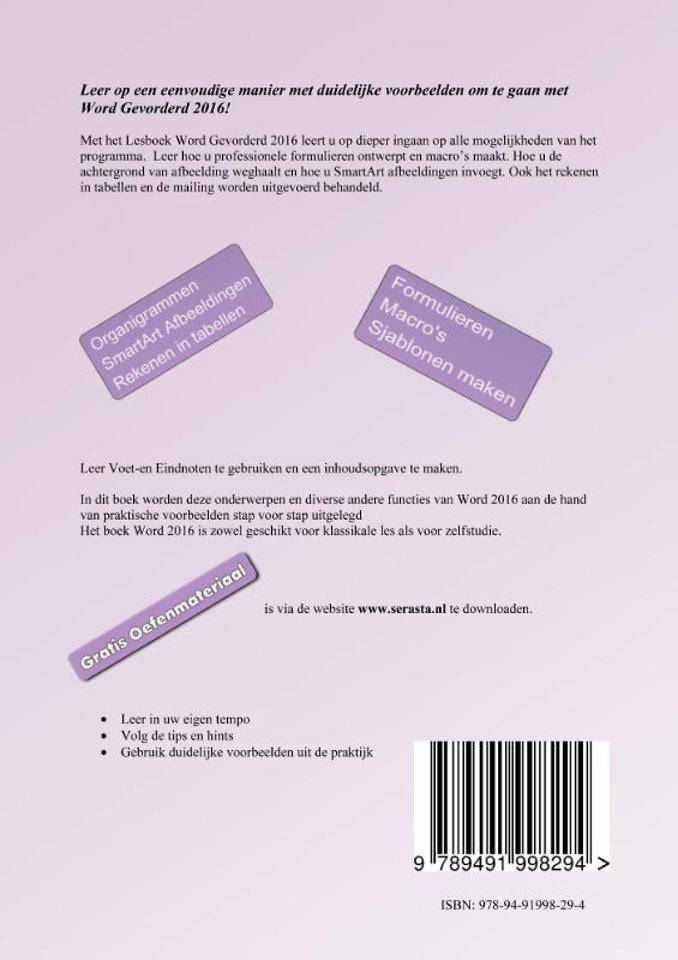 Met het Lesboek 'Word Gevorderd 2016' leert u op dieper ingaan op alle mogelijkheden van het programma. Leer hoe u professionele formulieren ontwerpt en macro's maakt. Hoe u de achtergrond van afbeelding weghaalt en hoe u SmartArt afbeeldingen invoegt. Ook het rekenen in tabellen en de mailing worden uitgevoerd behandeld.