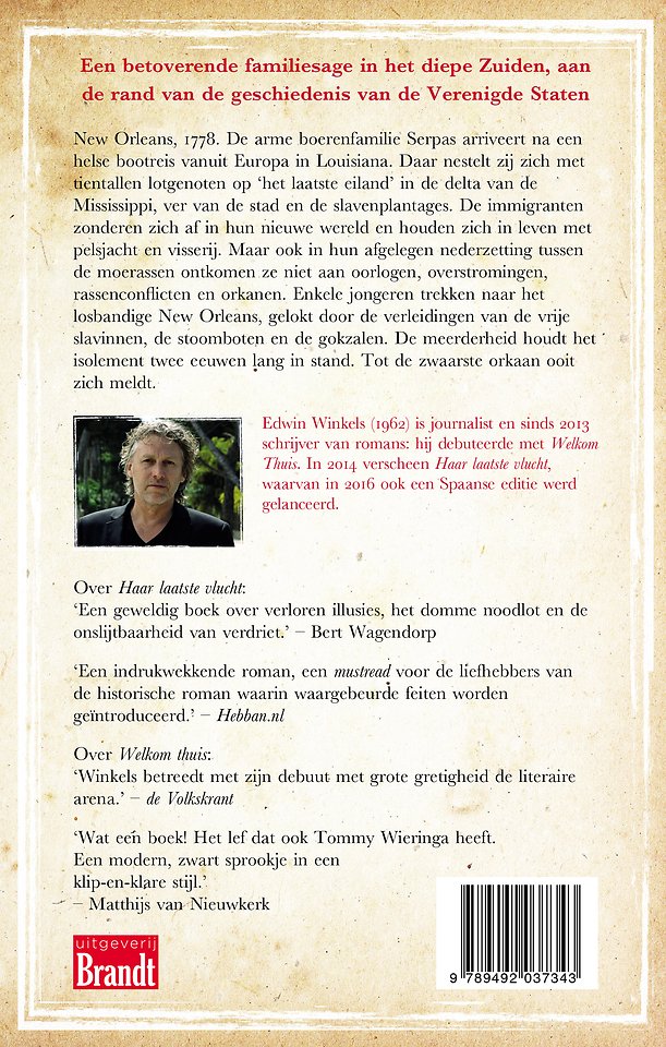 New Orleans, 1778. De arme boerenfamilie Serpas arriveert na een helse bootreis vanuit Europa in Louisiana. Daar nestelt zij zich met tientallen lotgenoten op 'het laatste eiland' in de delta van de Mississippi, ver van de stad en de slavenplantages. De immigranten zonderen zich af in hun nieuwe wereld en houden zich in leven met pelsjacht en visserij. Maar ook in hun afgelegen nederzetting tussen de moerassen ontkomen ze niet aan oorlogen, overstromingen, rassenconflicten en orkanen. Enkele jongeren trekken naar het losbandige New Orleans, gelokt door de verleidingen van de vrije slavinnen, de stoomboten en de gokzalen. De meerderheid houdt het isolement twee eeuwen lang in stand. Tot de zwaarste orkaan ooit zich meldt.